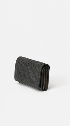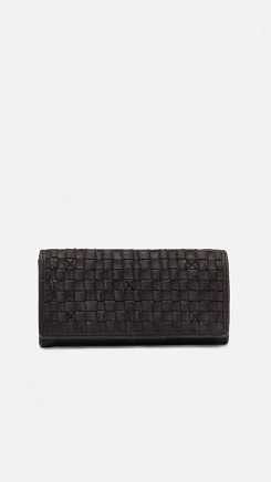Billetero grande de piel vacuna, lavada, de curtición vegetal, y trenzada a mano. Solapa, cierre con botón, compartientos para tarjetas, billetes y monedas. Dimensiones: 18 x 10