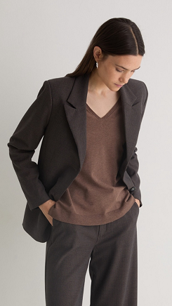 Blazer tejido Jacquard mezcla de fibras recicladas con viscosa con estampado de pata de gallo en color marrón. Con forro. Cuello pico con solapa. Manga larga. Puños con botón. Detalle abertura trasera. Dos bolsillos frontales de vivo y uno en el pecho.