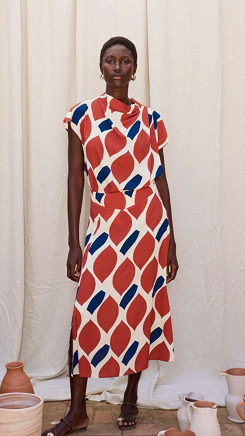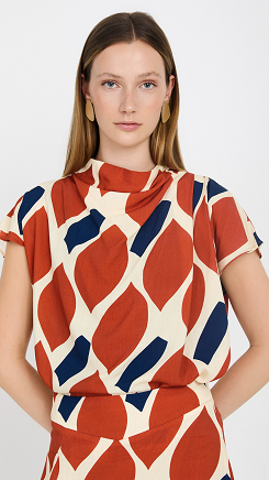 Blusa en tejido de viscosa con estampado gráfico. Cuello subido con frunce ligero en un hombro.y abertura en lagrima en la espalda. Mnaga sisa caida: Fitting recto.