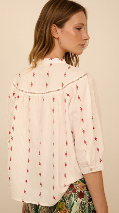 Blusa en tejido de algodón con estampado de flores a contraste. Detalle de entredós al tono. Cierre con botones delantaros de nacár. Manga al codo ligeramente abullonada