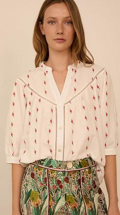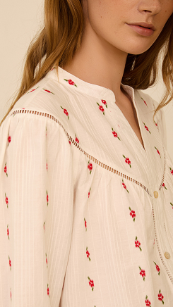 Blusa en tejido de algodón con estampado de flores a contraste. Detalle de entredós al tono. Cierre con botones delantaros de nacár. Manga francesa ligeramente abullonada