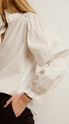 Blusa en algodón color blanco, con un diseño relajado. Presenta un escote en pico con posibilidad de cerrarlo con un botón, un cuello alto fruncido que aporta estructura y bordado de nido de abeja hecho a mano en los hombros. Las mangas largas abullonadas con fruncido elástico en el codo y en el puño que aportan volumen.