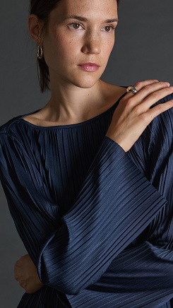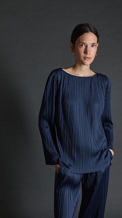 Blusa confeccionada en un tejido plisado en color berenjena. Corte ancho, escote barco y manga larga.