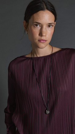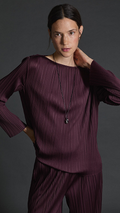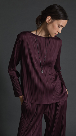 Blusa confeccionada en un tejido plisado en color berenjena. Corte ancho, escote barco y manga larga.
