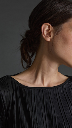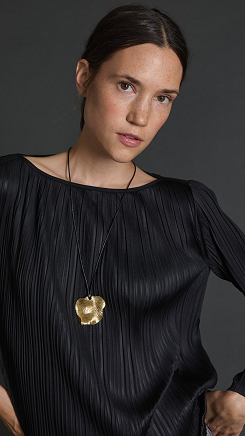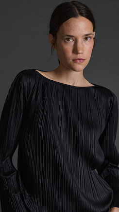 Blusa confeccionada en un tejido plisado en color negro. Corte ancho, escote barco y manga larga.