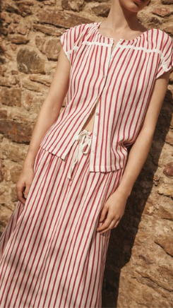 Blusa de manga corta en tejido con estampado de rayas rojas sobre fondo ecru. Cuello redondo y cierre delantero con botones de nacar. Detalle de cinta a contrate.