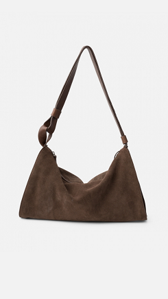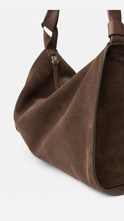 Bolso de serraje hidrofugado (repelente al agua). Asa de hombro de piel. Cierre con cremallera. Bolsillo interno. Forro de algodón. Medidas: 21 x 35 x 12 cm (Alto x Ancho x Fondo)