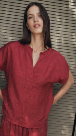 Top en tejido de color rojo con escote en V y caida relajada.Tejido ligero que aporta frescura y movimiento. Conjuntalo para un total look con el Pantalón Alba Red..