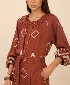 Camisa en tejido de cuadros vichy blanco y negro con apliques de encaje beige en forma de flores cerca del bajo que contrastan con el estampado geométrico. Corte amplio, con manga corta y botones delanteros en negro.