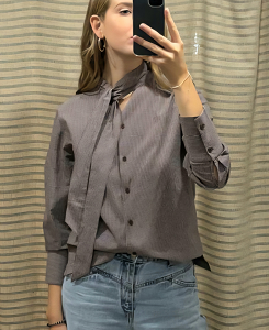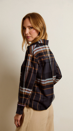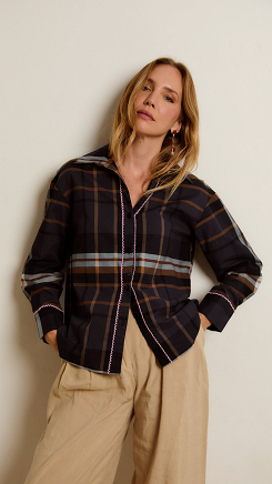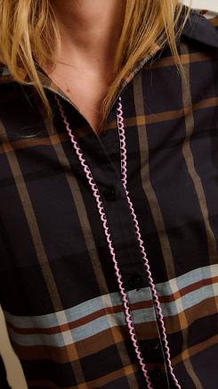 Camisa de algodón con estampado de cuadros. Tiene corte recto, botones delanteros visibles y puntilla en la rapera frontal en un tono rosa, que contrasta con los cuadros de la tela.