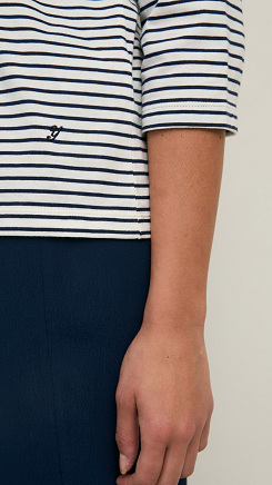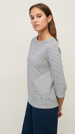 Camiseta de rayas en color azul marino y blanco de algodón orgánico. Corte regular, cuello barco y mangas 3/4. Detalle logo bordado. Tintura OEKO-TEX. Longitud desde el hombro: 60 cm (talla S). Made in Portugal.