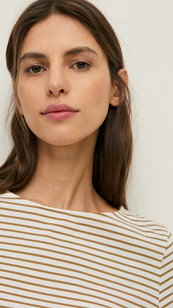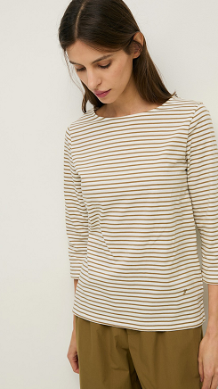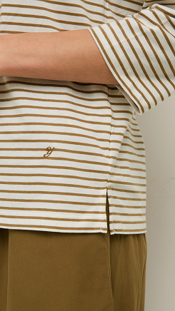 Camiseta caqui y crudo de algodón orgánico. Regular fit. Rayas bicolores. Cuello barco. Manga 3/4. Detalle logo bordado. Tintura OEKO-TEX. Longitud desde el hombro: 60 cm (talla S). Made in Portugal.