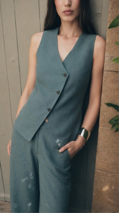 Chaleco en tejido color verde. Presenta escote pico y cierre frontal con botones cruzados negros que aportan contraste. Su corte ligeramente entallado realza la silueta.