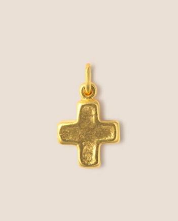 Charm con forma de cruz. La pieza incluye una argolla de quita y pon que permite adaptarla a distintas cadenas o pulseras. No incluye cadena