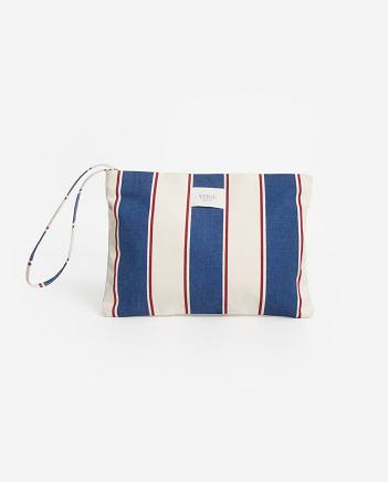 Clutch con estampado a rayas azul marino. Con cierre cremallera y asa lateral. Con forro y bolsillo interior. Detalle logo Yerse frontal. Made in Spain. Medidas: 30X21 cm