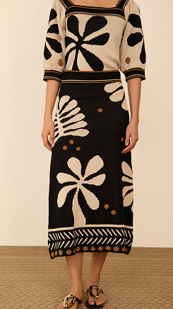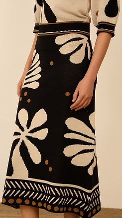 Falda midi en punto de viscosa con estampado abstracto. Corte recto con diseño entallado en la cintura y caída suave.