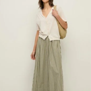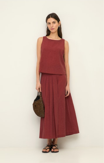 Falda larga en color teja. Es una falda recta con cierre de cremallera en la espalda y presenta otra capa de tela plisada que aporta movimiento.