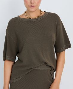 Falda de punto con textura y detalle de calados en el bajo. Cinturilla elástica de canalé. Silueta ligeramente ajustada.