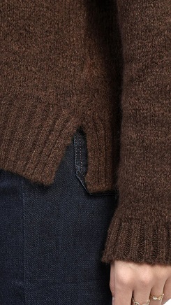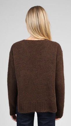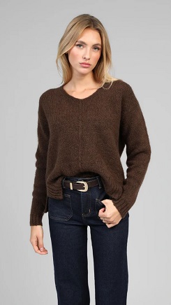 Jersey de manga larga en color marrón chocolate con cuello en pico. Tejido de punto suave. Ajuste holgado, largo regular.