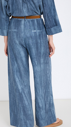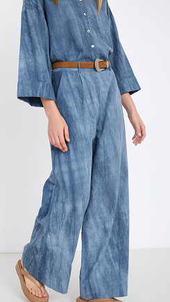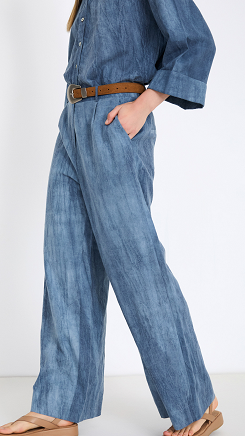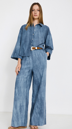 Pantalón confeccionado en tejido con textura tipo denim pero más ligero y flexible. Tiro alto, pierna ancha y recta con caída suelta que aporta comodidad y un movimiento natural al caminar.