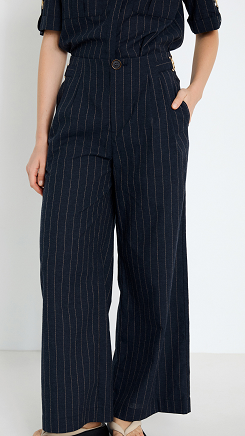 Pantalón largo en tejido con estampado de raya diplomática. Detalle de cintas laterales con hebillas metálicas doradas. De tiro medio con cierre fronatl con botón y cremallera.
