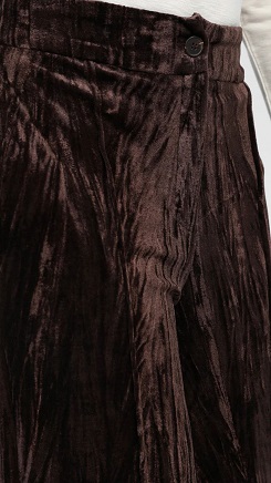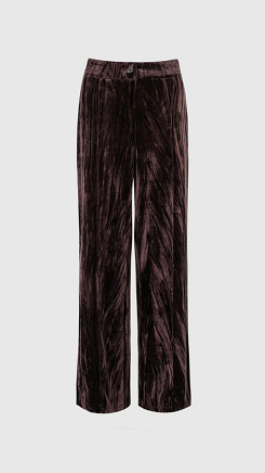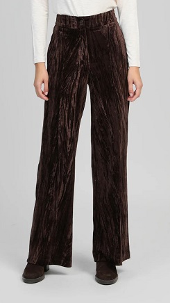 Pantalón recto de terciopelo arrugado en color marrón. Tiro alto con cinturilla elástica. Cierre con botón y bolsillos laterales