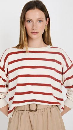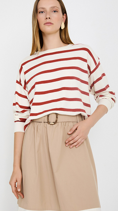 Sudadera de color crema claro con rayas en color terracota. Corte recto y relajado, con cuello redondo.