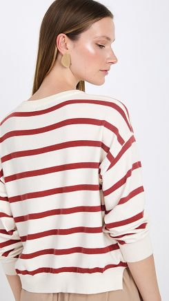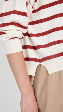 Jersey de punto fino de color crema claro con rayas en color terracota. Corte recto y relajado, con cuello redondo. Acabados en canalé en puños, cuello y bajos.
