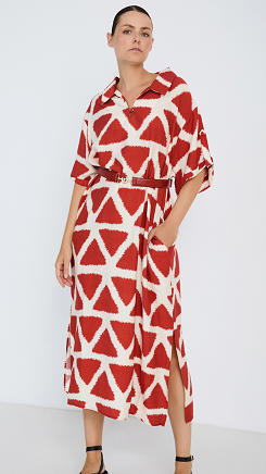 Vestido largo con tejido ligero con estampado geométrico en color rojo. Cuello camisero abierto en pico. Manga corta con dobladillo y botón.