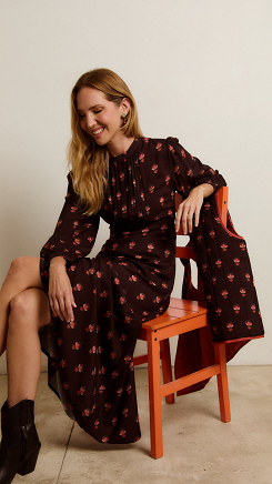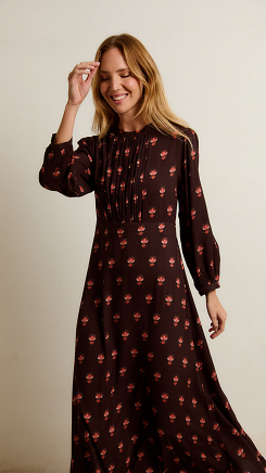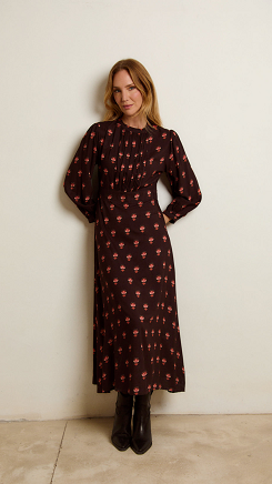 Vestido largo con estampado de flores sobre fondo de color marrón con un drapeado frontal. Diseño entallado en el cuerpo y falda evasé con ligero vuelo, que aporta movimiento.