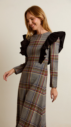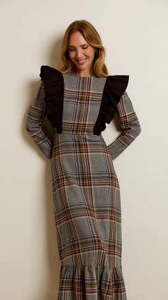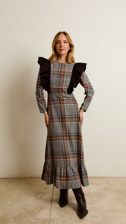 Vestido entallado con dos volantes amplios de popelín de algodón en color negro, que van desde la parte delantera a la trasera. La falda es evasé y lleva un volante. RECOMENDACION DE TALLAS: Este vestido da poca talla de cuerpo y cintura. La talla S equivaldría a una 36 o 38 pequeña, la talla M valdría para 38 o 40 pequeña, la talla L para una 40 o 42 pequeña. Si se duda entre dos tallas, es mejor elegir la más grande en este diseño.