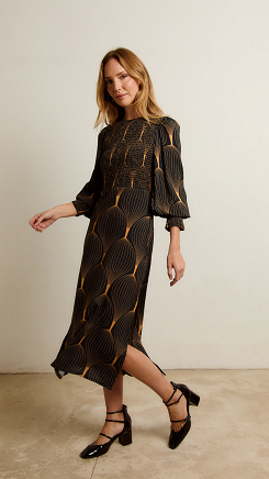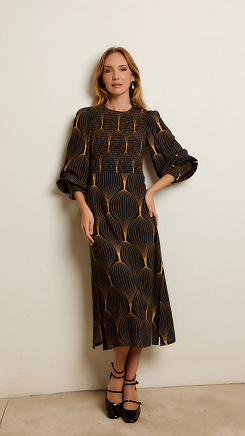 Vestido con cuerpo en nido de abeja elástico sólo por delante, la falda es recta y tiene dos aberturas laterales. Las mangas van fruncidas en los hombros y en los puños llevan nido de abeja. Cierre con cremallera invisible en la espalda para hacerlo más entallado. RECOMENDACIÓN DE TALLAS: Da poca talla de cintura y cadera, en caso de duda entre dos tallas, recomendamos elegir la más grande.