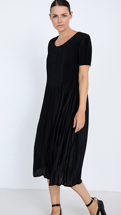 Vestido plisado con tejido técnico «non-iron». Con cuello redondo y manga corta. Modelo one size ajustable a todas las tallas.
